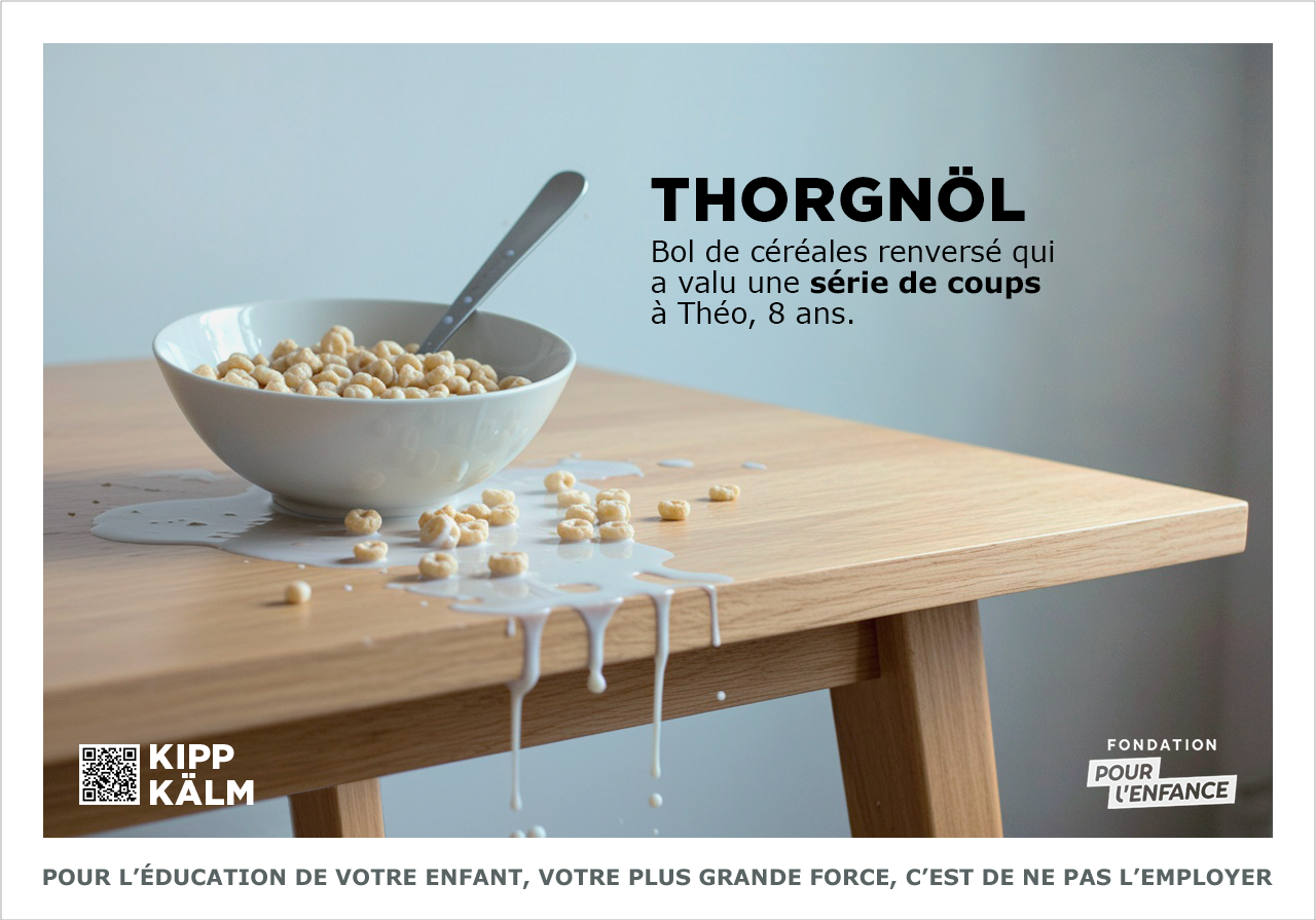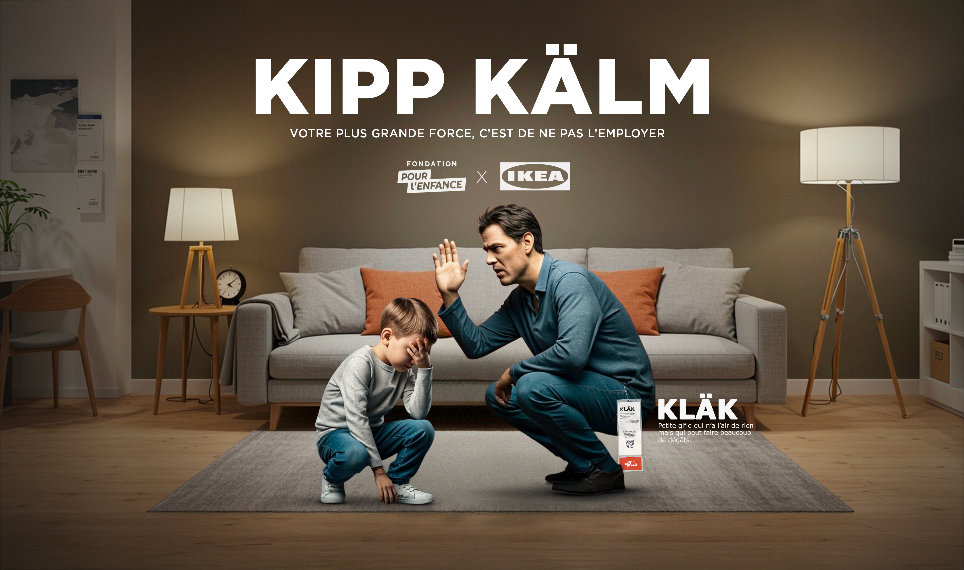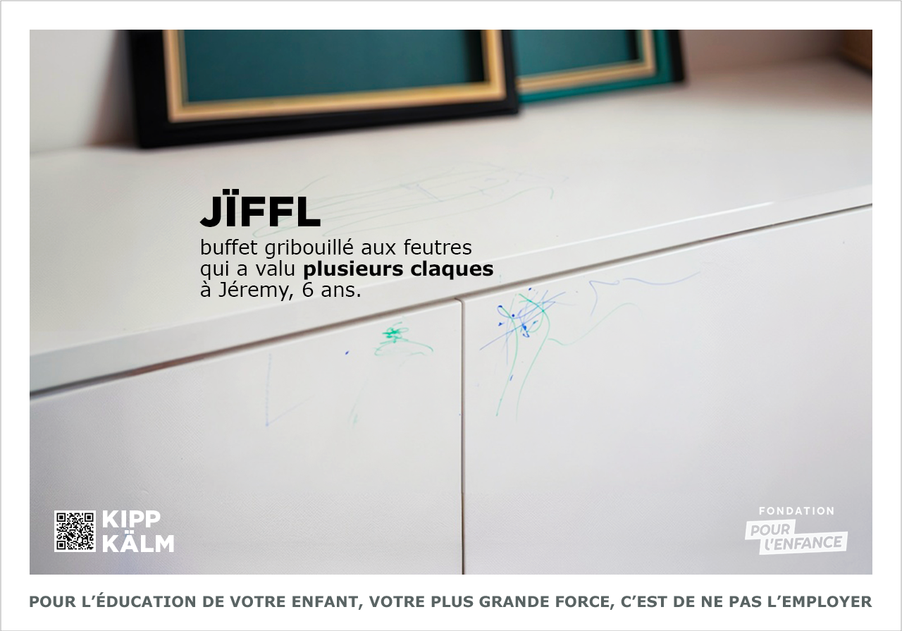 Une campagne inspirée des codes visuels d’IKEA, où les noms de produits deviennent des jeux de mots percutants et dérangeants, pour pour illustrer ces moments du quotidien où les parents craquent et laissent place à des réactions violentes.